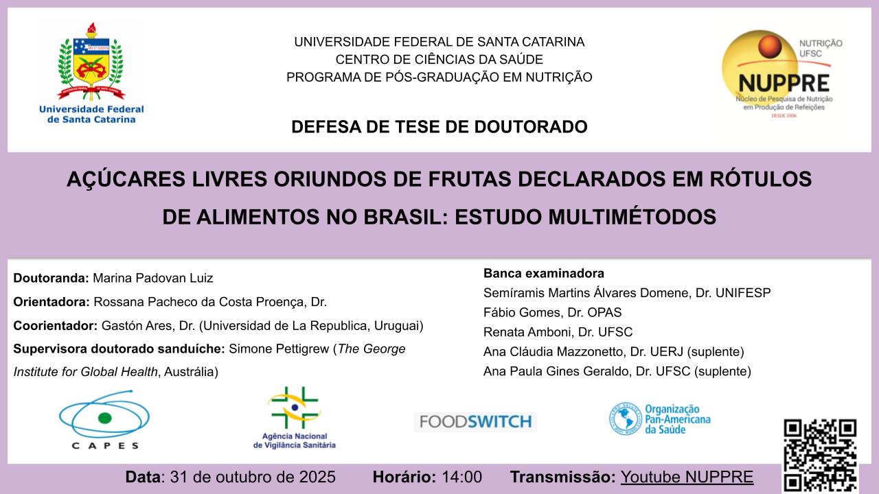 Convidamos para a defesa de tese da doutoranda Marina Padovan Luiz: “Açúcares livres oriundos de frutas declarados em rótulos de alimentos no Brasil: estudo multimétodos”, que ocorrerá dia 31/10/2025, às 14h.